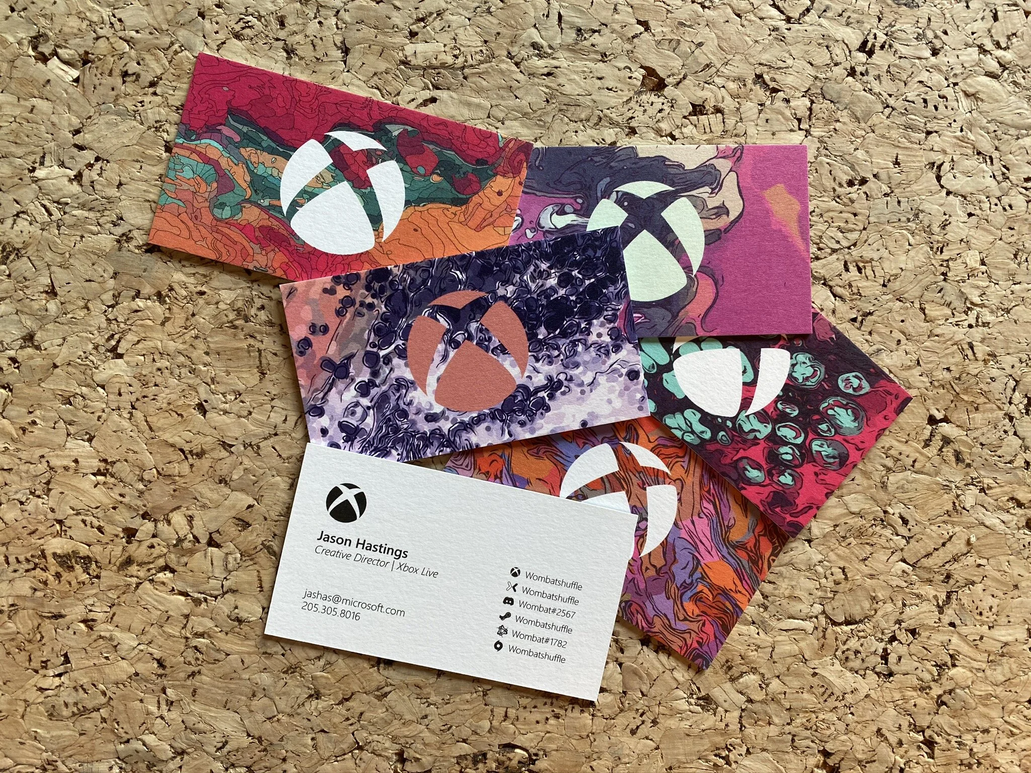 Started converting some interesting elements from some of my acrylic paintings into vector shapes. Changing hue, stroke weight, smoothness, and/or complexity, helped portrait the playful yet complex nature of Xbox Live. These shapes were converted to presentation backgrounds, business cards, logos, stickers and more